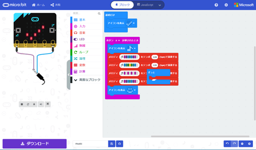 試しに、ver.1.5用に「microsoft MakeCode for microbit」で作成したプログラムをダウンロードしてみましたが、問題なくそのままver.2.0でも使え、プログラムした「かえるの歌」が流れました♪