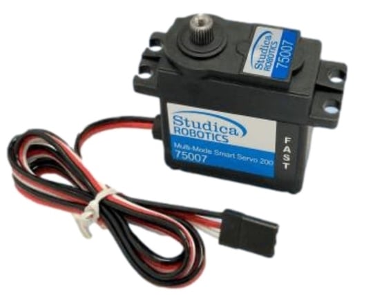 マルチモード スマート サーボ 200 は 200RPM で回転します。この角度のプログラム可能なサーボは、ロボットやプロジェクトでさまざまな役割を果たすことができます。標準モードでは、+/- 150 度の範囲で動作します。Studica スマート ロボット サーボ プログラマー (別売り) を使用すると、マルチモード スマート サーボを連続角度モード、標準角度モード、およびカスタム角度モードで実行するように構成できます。連続回転モードでは、サーボ コントローラーで送信した PWM 信号に基づいて、サーボは比例速度制御を行います。